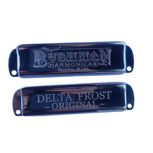 Replacement cover plates for the Bushman Delta Frost harmonicas. 1 set includes 1 top plate and 1 bottom plate as shown. Choose from Original, Steelie, or Woody.