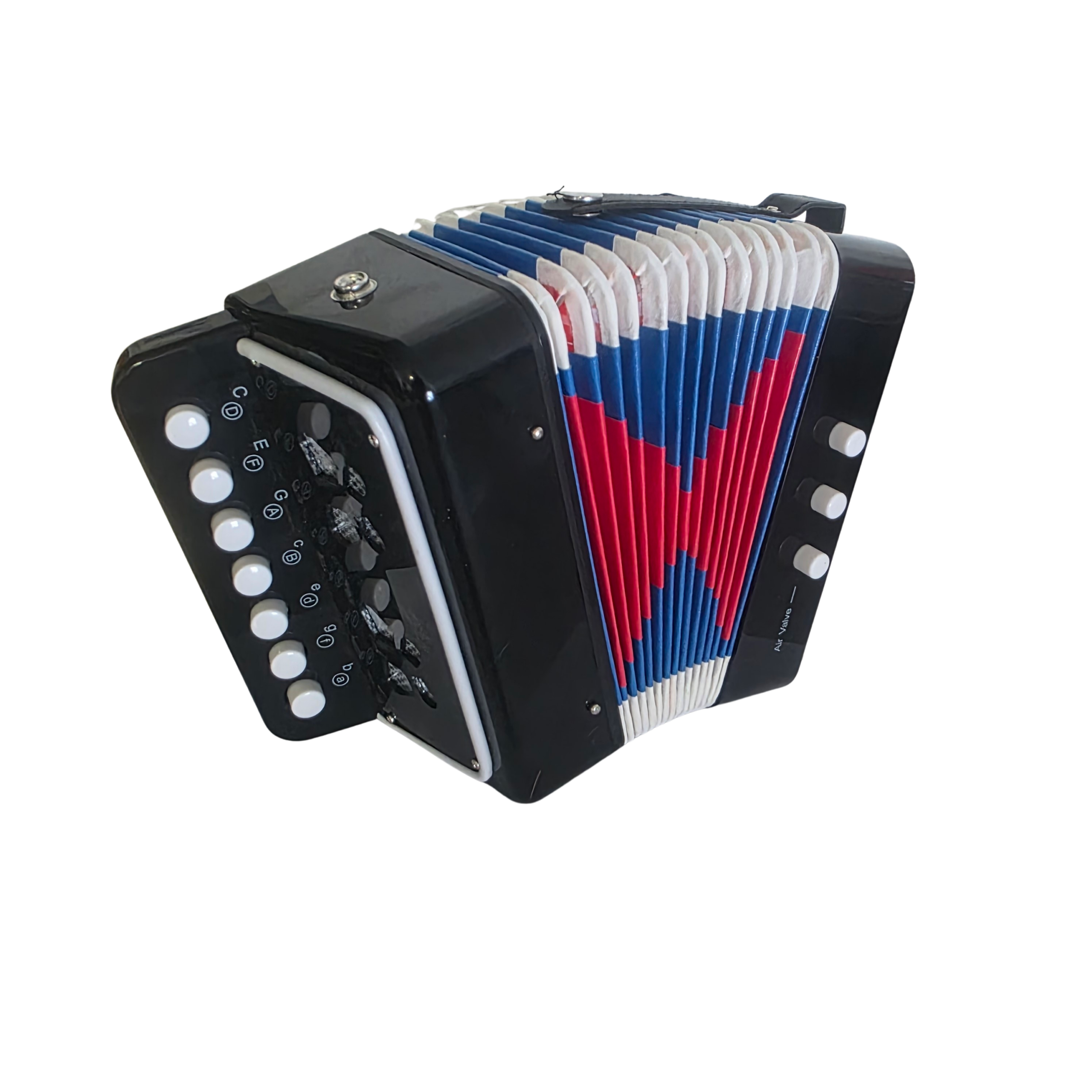 Diatonic accordion in the key of C.  7 melody buttons that cover 14 notes – just 1 note shy of featuring 2 complete octaves, and 2 harmony chord buttons – 1 high and 1 low, and 1 air release button.  Black finish with white buttons, and red, white and blue bellows.  Incredible price!